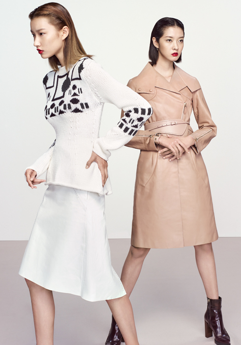 (왼쪽) 화이트 니트 톱, 화이트 레더 스커트 모두 토즈.(오른쪽) 베이지 레더 트렌치코트, 베이지 벨트, 핑크&골드 뱅글, 버건디 앵클부츠 모두 토즈. |