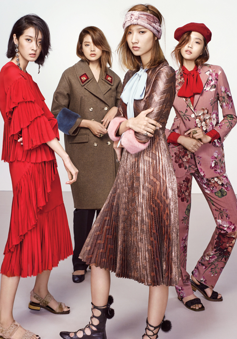 (두 번째) 카키 더블 코트, 다크 그린 팬츠, 블랙 로 힐 슬링백 펌프스, 라이언 모티브 링 모두 구찌. (세 번째) 퍼플 퍼 리본 헤어밴드, 골드 플리츠 드레스, 블랙 레더 레이스업 부츠, 메탈 링 모두 구찌. (오른쪽) 체리 컬러 울 모자, 레드 리본 실크 셔츠, 플라워 패턴 재킷, 플라워 패턴 팬츠, 골드 라이언 모티브 링, 블랙 퍼 샌들 모두 구찌. |