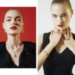 (두 번째) 블루 실크 셔츠, 베이지 도트 패턴 니트 베스트, 베이지 도트 패턴 팬츠, 블랙 슈즈 모두 보테가 베네타. (세 번째) 블랙 도트 패턴 셔츠, 그린 도트 패턴 재킷, 그린 도트 패턴 팬츠, 라이트 골드 슈즈 모두 보테가 베네타. (오른쪽) 도트 패턴 슬리브리스 드레스, 내추럴 베이지 그레이 네크리스, 내추럴 블루 그레이 네크리스, 브론즈 슈즈 모두 보테가 베네타. |