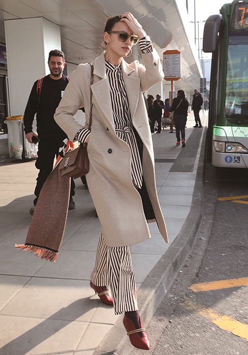 6 몰트 브라운 색상의 TB 백을 착용한 모델 이리나 샤크.