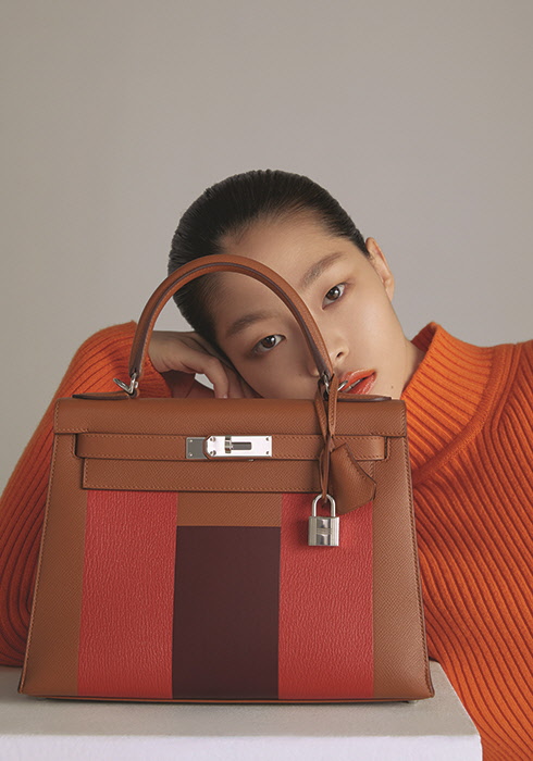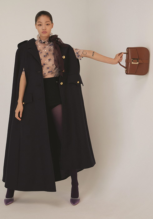 | 네이비 케이프 4백90만원, 플라워 프린트 톱 2백만원, 블랙 니트 쇼츠 80만원, 퍼플 펌프스 1백20만원 모두 미우미우. 캐멀 레더 백 3백91만원 로저 비비에. | 오렌지 니트 드레스, 브라운 레더 백 모두 가격 미정 에르메스. |
