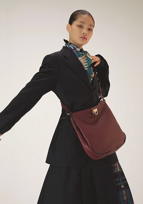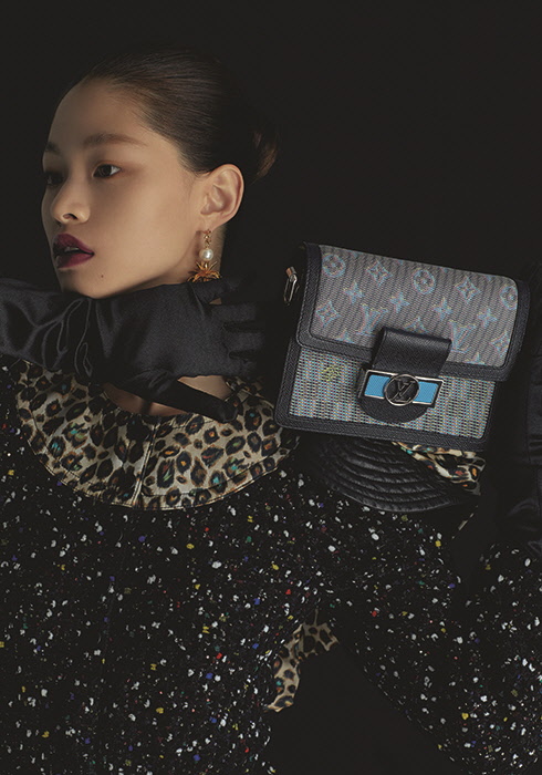 | 레오퍼드 칼라 드레스, 골드 진주 장식 이어링, 블루 모노그램 미니 백 모두 가격 미정 루이 비통. 글러브는 스타일리스트 개인 소장품. | 다크 그레이 재킷 3백9만원, 스커트 2백75만원, 프린트 블라우스 가격 미정, 버건디 숄더백 1백65만원 모두 살바토레 페라가모. |