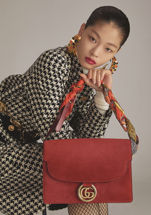 | 프린트 재킷 5백30만원, 화이트 니트 이너 가격 미정, 스커트 2백20만원, 멀티컬러 골드 이어링 1백17만원, 스카프 장식의 레드 스웨이드 숄더백 4백19만원, 벨트 가격 미정 모두 구찌. |