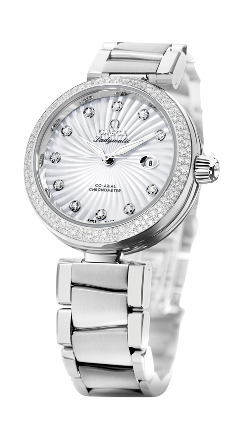 레이디매틱(Ladymatic)은 오메가가 지난해 처음 소개한 여성 시계다. 코-액시얼 이스케이프먼트, Si14 실리콘 밸런스 스프링을 적용한 8502/8521 셀프 와인딩 무브먼트를 탑재하면서 케이스를 키우지 않고 외관상 개성을 살리기 위해 애썼다. 케이스 측면에는 다이얼과 동일한 컬러의 세라믹 링을 넣고 그 위에 물결과 같은 웨이브 장식을 넣었다. 직선과 대칭보다는 곡선과 비대칭으로 제작한 브레이슬릿도 개성이 넘친다. 베젤은 크기가 다른 다이아몬드를 촘촘하게 세팅하는 스노 세팅 기법으로 광채를 더 극대화했다.