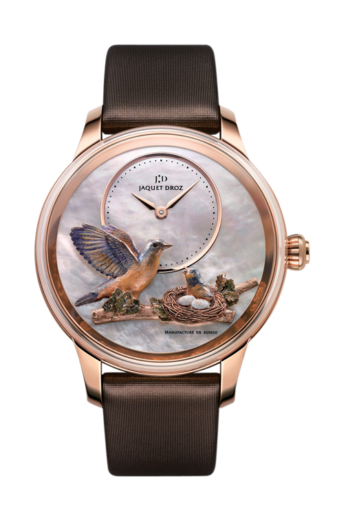 자케 드로는 기계적으로 소리를 내는 뮤직박스나 자동으로 움직이는 인형으로 유명했다. 그가 만든 뮤직박스 중엔 진짜 깃털을 붙인 새가 노래하는 것도 있었다. 이런 전통을 새롭게 재해석한 것이 엘레강스 파리 컬렉션의 프티 에르 미닛 와조(Petite Heure Minute Oiseau)와 프티 에르 미닛 릴리프(Petite Heure Minute Relief)다. 전자는 새를 직접 그린 에나멜 다이얼을, 후자는 18K 골드 소재로 제작한 새 부조를 다이얼 위에 얹은 형태로, 섬세함이 특징이다.