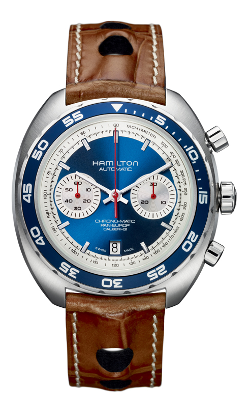 쿼츠 무브먼트의 시대가 도래하기 전 해밀턴은 지금은 없어진 ‘뷰렌’이라는 제조사와 손잡고 아주 얇은 기계식 무브먼트와 셀프 와인딩 크로노그래프 무브먼트를 개발했다. 1971년 소개한 판 유럽(Pan Europ)은 바로 그 무브먼트를 탑재한 모델이다. 올해 이를 같은 이름으로 재현했는데, 사각형에 가까운 케이스, 우아한 블루 컬러의 다이얼과 베젤, 가시성을 높인 핸즈 등은 지금 봐도 현대적이다.
