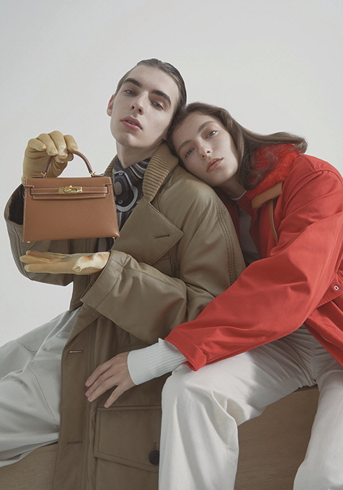 (남성) 브라운 레더 코트, 패턴 셔츠, 화이트 팬츠, 브라운 켈리 백 모두 가격 미정 에르메스. |