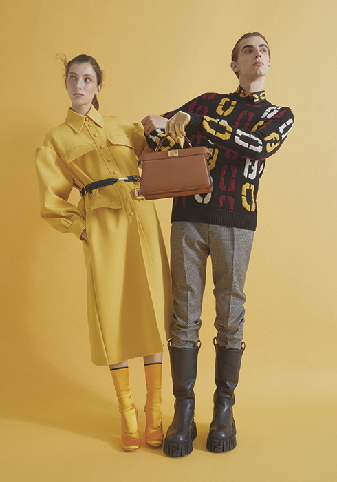 (남성) 멀티컬러 니트 톱 1백만원대, 셔츠 1백만원대, 체크 팬츠 가격 미정, 블랙 부츠 가격 미정, 브라운 피카부 백 4백만원대 모두 펜디. |