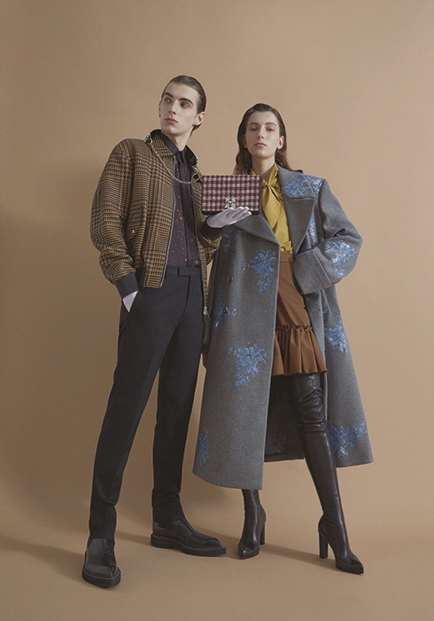 (남성) 브라운 체크 블루종, 블랙 셔츠, 팬츠, 부츠 모두 가격 미정 벨루티. 핑크 하운즈투스 체크 백 4백40만원 로저 비비에. |