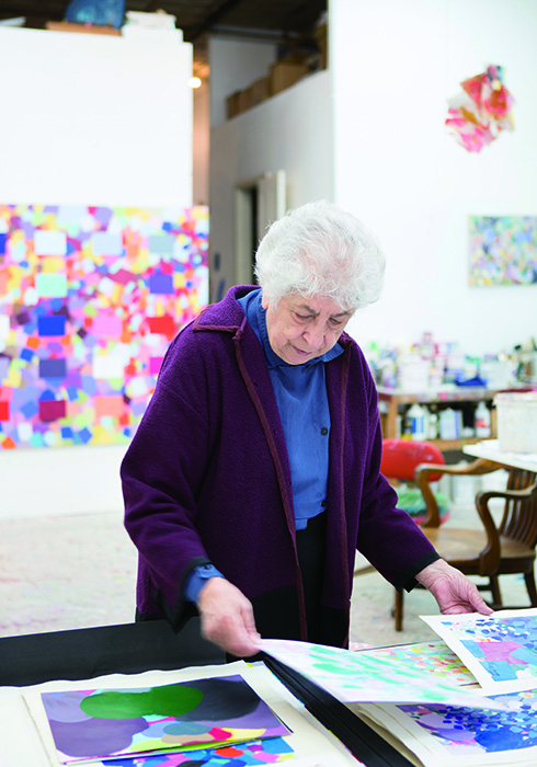 비바람이 몰아치던 4월의 어느 날, 사미아의 그림을 떠올리게 하는 노란 튤립 한 다발을 들고 뉴욕 트라이베카에 위치한 그녀의 스튜디오로 향했다. 엘리베이터도 없는 전형적인 뉴욕의 오래된 건물 2층으로 삐그덕거리는 계단을 따라 올라가니 사미아가 먼저 나와 반긴다. 작업실 겸 보금자리로 쓰이는 기다란 직사각형 공간은 주인의 검박하고 담대한 성격을 보여주는 듯 50년 작업 인생의 ‘하이라이트’가 거실 한가운데, 침실 벽면, 작업실 구석 등 곳곳에 무심히 자리 잡고 있었다. 인간의 눈이 구(球), 실린더, 나선, 원형 등의 사물을 바라보는 과정을 빛과 그림자 효과 등을 통해 정교하게 탐구한 초기작 시리즈, 세상의 모든 아름다운 색깔을 채집해둔 듯한 컬러 시리즈, 페인팅을 하나하나 오려서 모빌처럼 콜라주한 설치 작품 시리즈 등 눈길 닿는 곳곳마다 그녀의 예술혼이 담담하게 빛을 발하는 듯했다.