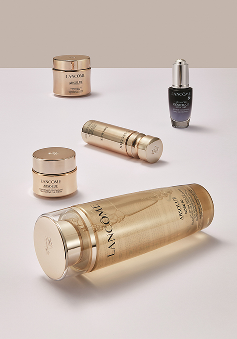 (위부터) 압솔뤼 소프트 크림 60ml 39만원대, 제니피끄 더블 드롭 앰플 20ml 12만원대, 압솔뤼 올레오 세럼 30ml 38만원대, 압솔뤼 아이크림 20ml 22만원대, 압솔뤼 로즈 80 에센스 로션 150ml 13만원 모두 랑콤. 문의 080-001-9500