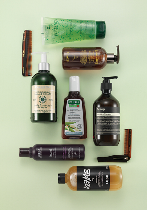 (위부터) ‘르네휘테르 포티샤 샴푸’‘ 모발 뿌리에 영양분이 닿아 두피와 모근 강화에 도움을 주는 에센셜 오일 영양 샴푸. 모든 모발 타입에 적당하다(200ml 2만6천원). ‘로웰 얼그레이 레미디 스칼프 샴푸’ 찻잎을 우려 얼그레이 원료를 추출하고 9가지 이상의 자연 원료와 블렌딩했다. 두피에 주는 자극을 줄이고 유해 활성 산소를 억제해 노화를 늦춘다(300g 2만8천원). ‘록시땅 아로마 스트렝스 샴푸’ 가늘고 힘없는 모발을 건강하고 볼륨감 있게 만들어주고 모발 손실을 방지해준다(500ml 4만2천원). ‘라우쉬 윌로우바크 트리트먼트 샴푸’ 각질 제거 기능이 있어 약해진 두피와 가늘어진 모발을 튼튼하게 해주는 샴푸(200ml 2만4천원). ‘이솝 볼류마이징 샴푸’ 가늘고 얇고 게다가 처지는 머리카락이 고민이라면 적극 추천한다. 두피 청결은 물론 모근 사이의 모발을 분리하고 머리카락이 서로 엉키지 않게 하는 효과까지 있다(500ml 6만5천원). ‘아베다 인바티 어드밴스드TM 엑스폴리에이팅 샴푸’ 17년간의 연구와 5년간의 개발로 완성한 인삼과 강황 발효 함유가 두피 활력을 강화하고 암라 성분을 함유한 포뮬러는 모발을 두껍고 풍성하게 보이게 한다(200ml 3만7천원대). ‘러쉬 리햅 샴푸’ 해초 즙을 주성분으로 과일 효소와 허브 오일을 배합했다. 손상된 머리카락을 보호하고 더러워진 두피를 상쾌하게 씻어 두피와 모발에 휴식을 준다(500g 6만2천원).