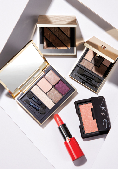 Essential shades(가운데부터 시계 방향으로) 버버리 컴플리트 아이 팔레트 고밀도 입자로 이루어진 골드 팔레트. 5.4g 6만5천원. 입생로랑 꾸뛰르 팔레트 몬드리안 드레스에서 영감을 얻은 다섯 가지 컬러를 담은 아이섀도 팔레트. 5g 8만3천원대. 나스 블러쉬 언로플 어떤 피부 톤에나 건강한 혈색이 돌게 하는 블러셔. 4.8g 3만9천원. 조르지오 아르마니 루즈 액스터시 빈틈없는 완벽한 레드 립을 만드는 립스틱. 4g 3만9천원. 에스티 로더 퓨어 칼라 엔비 스컬프팅 아이섀도우 팔레트  베이스부터 중간 톤, 포인트 컬러까지 담아 그윽한 아이 메이크업을 완성한다. 7g 7만원대. Alluring scent(가운데부터 시계 방향으로) 앳킨슨 24 올드 본드 스트리트 오드코롱 2백 년 이상의 역사를 이어온 영국의 대표적인 니치 향수 브랜드 앳킨슨의 상쾌한 향수. 50ml 13만5천원. 보테가 베네타 놋 오드 퍼퓸 만다린, 라임 열매, 네롤리의 상쾌한 톱 노트와 머스크, 통카 빈의 베이스 노트가 어우러진 이국적인 향수. 50ml 15만원. 조 말론 런던 피오니 앤 블러쉬 스웨이드 화려하게 핀 작약과 붉은 사과, 재스민이 부드러운 관능미를 선사하는 향수. 30ml 8만4천원대. 존 바바토스 빈티지 EDT 클래식한 남자를 위한 매력적인 향수 75ml 8만2천원.