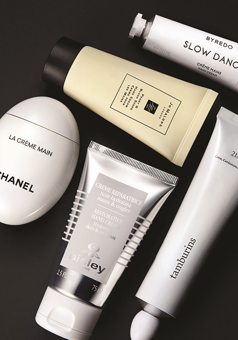 (오른쪽 위부터 시계 방향으로) 바이레도 슬로우 댄스 핸드크림 매혹적인 오포파낙스 향으로 시작해 달콤한 바닐라와 파촐리로 이어진다. 향이 비교적 오래 지속되어 향수 대용으로도 좋다. 시어버터 성분 덕분에 가볍고 촉촉하게 발리며, 콤팩트한 사이즈라 실용적이다(30ml 4만8천원). 탬버린즈 누드에이치앤드크림 #218 탬버린즈에서 새롭게 선보인 고보습 핸드크림으로 카다멈의 스파이시한 풍미를 메인으로 라임의 친숙한 달콤함, 앰버의 따뜻함을 강렬하면서도 독특하게 표현했다.(65ml 3만2천원). 시슬리 레빠라뜨리스 핸드크림 바이오사카라이드 솔루션과 슈거, 밤나무 추출물이 피부 지질 장벽을 강화하고, 시어 오일이 손을 부드럽고 편안하게 유지해준다. 하르타고피툼근 추출물이 피부 진정에 도움을 주며, 프로 비타민 B5, 아몬드 오일 성분을 함유해 손 피부뿐 아니라 큐티클 관리에도 효과적이다(75ml 10만원). 샤넬 라 크렘 망 피부를 매끄럽고 부드럽게 만들어주는 메이 로즈 왁스와 피부 톤을 환하게 밝혀주는 아이리스 팔리다 추출물이 손 관리에 도움을 준다. 가벼운 크림 제형이 부드럽게 발리고 빠르게 흡수된다. 은은하면서도 편안한 향(50ml 8만원). 조 말론 런던 피오니 앤 블러쉬 스웨이드 핸드크림 브랜드의 베스트 향을 핸드크림으로 선보였다. 같은 향의 코롱과 함께 사용하면 더없이 좋은 아이템. 작약과 붉은 사과의 향기로운 과즙, 재스민과 장미, 그리고 카네이션을 조합한 향이 긴 여운을 남긴다. 끈적임 없이 촉촉하게 발려 산뜻하게 마무리된다(50ml 4만6천원).