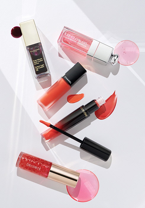 클라랑스 인스턴트 라이트 립 컴포트 오일 #08 블랙베리 진정 효과를 갖춘 미라벨 자두, 재생에 도움을 주는 헤이즐넛, 보습력이 우수한 오가닉 호호바 오일 등 세 가지 오일 성분을 담아 풍부한 영양감을 자랑한다. 블랙베리 컬러로 은은하면서도 관능적인 메이크업을 연출할 수 있다. 7ml 2만8천원. 디올 어딕트 립 글로우 #007 라즈베리 입술 톤에 어울리는 틴티드 효과로 맞춤형 생기를 선사해 모든 피부 톤에 잘 어울린다. 체리 오일 성분이 입술을 매끄럽고 도톰해 보이도록 해준다. 6ml 4만4천원대. 샤넬 루쥬 알뤼르 잉크 #148 리베레 약 8시간의 지속력을 자랑하는 아이템. 입술에 가볍게 스며드는 부드러운 실크 텍스처가 특징으로, 섬세하면서도 우수한 발색력을 갖췄다. 6ml 4만6천원. 랑콤 압솔뤼 에나멜 라커 #315 마치 에센스를 바른 듯 촉촉하게 마무리되는 텍스처가 매력적이다. 얇고 부드러운 애플리케이터로 정교한 입술 표현이 가능하며, 여러 번 덧바르면 컬러와 광택이 강렬해져 매혹적인 입술 메이크업을 완성할 수 있다. 8ml 4만8천원대. 데코르테 립 오일 #03 럭키 카멜리아 아라비안 재스민 꽃, 포도씨 오일 추출물 등 여섯 가지 식물성 오일을 함유했으며, 물보다 가벼운 오일 형태의 스콸란 성분으로 끈적임 없이 산뜻하게 마무리된다. 자연스러운 혈색과 윤기를 부여해 데일리 뷰티 아이템으로 적합하다. 4.7ml 3만2천원.
