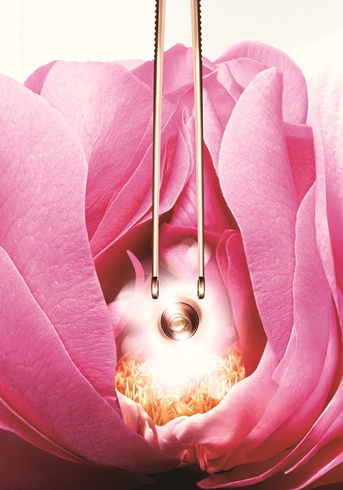 화장품 원료로서 장미의 가치는 매우 놀랍다. 수많은 브랜드에서 메인 원료로 사용하는 만큼 장미 자체는 매우 전통적인 소재이지만, 랑콤의 장미는 다르다. 랑콤의 창립자인 아르망 쁘띠장이 80년 전에 첫선을 보인 최초의 랑콤 제품인 향수도 장미에서 시작된 것은 물론, 압솔뤼를 포함한 랑콤의 전 제품을 이야기할 때 장미 성분은 떼려야 뗄 수 없는 관계다. 그중 압솔뤼 렉스트레에는 장미 줄기세포 성분을 메인으로 사용했기에 장미 성분으로 진검 승부를 가른다면 랑콤이 승리를 거둘 것이다. 랑콤은 장미에서 추출할 수 있는 가장 확실한 성분을 다양한 기술과 방법으로 추출하고 제품에 적용하는 노하우를 쌓아왔다. 그 결정체가 바로 압솔뤼 렉스트레인 것. 그렇다면 ‘압솔뤼 렉스트레 크림’에 담겨 있는, 피부에 즉각적으로 작용하는 성분이 진귀하고 특별한 이유는 무엇일까? 이 크림에 2만여 종의 장미를 조합해 활력과 생기, 적응력을 지닌 특별한 장미를 엄선해 랑콤 장미를 완성하고, 줄기세포에서 추출한 성분을 응축해 담아냈다고 하면 믿을 수 있겠는가? 어렵겠지만 우리가 꼭 기억해야 하는 기술은 퍼모제네시스(fermogenesis)다. 불멸의 장미 줄기세포 추출법이라 불리는 이 기법은 오직 랑콤에서만 구현되는, 마치 연금술의 마법과도 같은 결과를 불러일으킨다. 이는 살아 있는 그대로의 장미 줄기세포를 추출하는 과정으로, 장미 본연의 특성과 효능이 추출 과정에서 파괴되지 않도록 코쿠닝(cocooning) 배양 과정을 기초로 한 특허 기술을 담은 것이다. 이 과정을 들여다보면 마치 새로운 세포를 만들어내 완전히 깨끗한 생물체를 창조하는 것처럼 신비롭다. 배양 과정에만 10주가 걸리기에 마치 새로운 생명 탄생의 순간을 목격하는 것처럼 특별하다. 이를 통해 살아 있는 랑콤 장미 세포를 추출하는데, 이렇게 세심하게 추출한 원료가 자연 상태 그대로의 신진대사와 리듬을 유지해 랑콤 장미의 탁월한 생명력을 그대로 간직하게 되는 것이다. 이와 더불어 ‘렉스트레 앰플 에센스’에 적용된 프레세 공법도 눈여겨봐야 할 랑콤의 핵심 기술이다. 장미 줄기세포에 고압을 가해 입자를 더 작게 압축해 피부 속 깊숙이 도달하게끔 하는 특별한 기술로, 이는 랑콤이 비단 뛰어난 성분을 담아내는 데만 집중하는 것이 아닌, 침투율과 도달률까지 높일 수 있는 기술력까지 겸비해 완벽을 추구한다는 점을 엿볼 수 있는 대목이다.