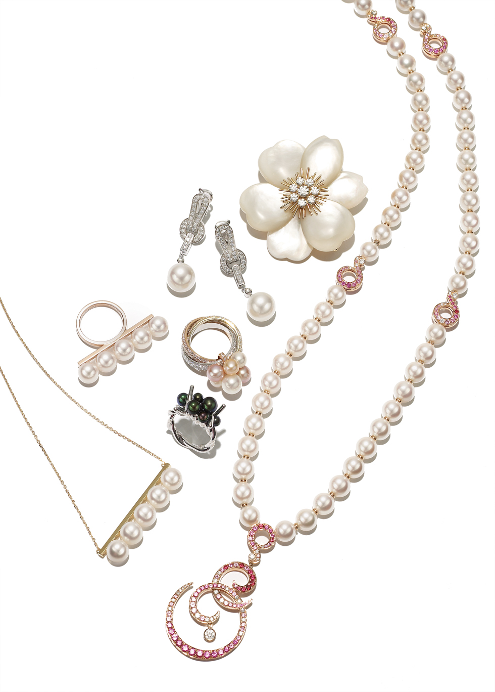 옐로 골드 바에 진주를 얹은 미니멀한 디자인의 밸런스 네크리스 5백50만원 타사키. 옐로 골드에 최상급 아코야 진주를 일렬로 세팅한 밸런스 링 2백70만원대 타사키. 클래식한 디자인의 아그라프 컬렉션 펄 이어링 2천6백만원대 까르띠에. 진줏빛 머더오브펄을 사용해 만든 아름다운 꽃 브로치 가격 미정 반클리프 아펠. 가장 값진 핑크 컬러 진주를 사용한 오와조 드 파라디 롱 네크리스 가격 미정 반클리프 아펠. 철조망을 연상케 하는 디자인에 흑진주를 세팅한 미하라 야스히로 by 타사키 컬렉션 링 80만원대 타사키. 브랜드의 상징인 트리니티 링에 진주를 세팅한 트리티니 펄 링 4천3백만원대 까르띠에.