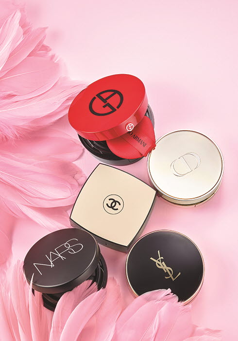 출시하자마자 품절 대란을 일으킨 화제의 쿠션 팩트, ‘조르지오 아르마니 투 고 쿠션’은 몇 번만 두드려도 놀랍도록 쫀쫀하고 매끄럽게 피부에 밀착되어 마치 본연의 피부가 좋은 듯 은은한 빛이 감도는 맑은 피부를 연출한다. 커버력과 유지력 또한 우수하고, 콧방울, 눈 밑 등 굴곡진 부위까지 꼼꼼히 바를 수 있도록 고안한 뾰족한 형태의 퍼프가 내장되어 있다(15g 8만9천원대). 디올의 하이엔드 라인에서 선보이는 쿠션 팩트인 ‘디올 프레스티지 르 쿠션 뗑 드 로즈 SPF 50+ PA+++’는 프레스티지 라인답게 성분, 발림성, 편안한 느낌과 더불어 디올 쿠션 제품 중 가장 뛰어난 커버력을 갖춘, 디올 쿠션 팩트의 결정판이다. 진귀한 로즈 드 그랑빌 장미 꽃잎 5백여 장과 함께 빛을 반사하는 반투명 펄을 함유해 피부를 화사하게 밝히고, 내 피부처럼 자연스럽고 가볍게 밀착되는 크리미한 멜트-어웨이 텍스처가 여러 번 덧발라도 피부를 편안하게 유지해준다(15g 12만원대). 스타일리시한 블랙 패키지만으로도 소장 가치가 높은 ‘입생로랑 르 쿠션 엉크르 드 뽀 SPF 23 PA++’는 ‘잉크’라는 이름처럼 완벽한 커버력과 하루 종일 메이크업이 무너지지 않는 지속력을 자랑하는 쿠션 팩트다. 덧발라도 뭉치거나 모공에 끼지 않으며 시간이 지나도 번들거리지 않는 것이 특징. 아시아 여성의 피부를 위해 개발한 네 가지 컬러로 자연스럽고 건강한 피부 톤을 연출한다(14g 7만9천원대). 나스의 베이스 메이크업 노하우를 고스란히 담은 ‘나스 아쿠아 글로우 쿠션 파운데이션 SPF 23/ PA++’은 나스만의 독자적인 기술력을 적용해 수분이 강화된 텍스처가 가벼우면서 하루 종일 촉촉한 피부를 선사한다. 라이트 리플레팅 콤플렉스를 함유해 피부 고유의 눈부신 광채를 끌어내 메이크업 효과를 극대화하는 것 역시 나스만의 노하우다(12g 케이스 2만3천원, 리필 4만원). 샤넬의 베스트셀러 베이스 제품인 레 베쥬 파운데이션의 명성을 고스란히 이어받은 ‘샤넬 레 베쥬 헬시 글로우 젤 터치 파운데이션 SPF 25/ PA+++’은 한 듯 안 한 듯 자연스러우면서 건강한 혈색을 표현해 보다 내추럴한 메이크업을 원하는 이에게 제격이다. 아쿠아-젤 에멀션을 함유해 스킨케어 제품으로 착각할 정도로 가볍고 촉촉하다. 풍부한 수분력과 쿨링 효과로 피부에 발랐을 때 즉각적인 상쾌함이 느껴져 자외선에 자극받은 피부에 바르면 진정 효과까지 얻을 수 있다(11g 7만9천원).