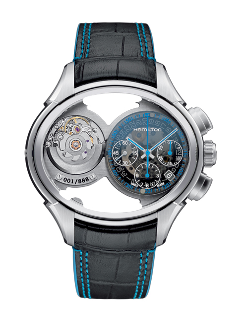 오트 쿠튀르 트렌드를 접목해 시각적인 아름다움을 추구하는 콘셉트를 뛰어넘은 디자인의 워치가 나타났다. 혁신적인 디자인과 기술력을 바탕으로 한 해밀턴의 놀라운 디자인의 워치 페이스 투 페이스(Hamilton Jazzmaster Face2face). 듀얼 아이덴티티라는 모토 아래 아방가르드함과 클래식이라는 서로 완전히 다른 특징을 하나의 시계에 담고 있다. 베젤 안에서 회전하는 독특한 케이스는 2개의 다이얼을 품고 있는데, 하나는 보이 레이서 크로노그래프 다이얼, 다른 하나는 3개의 핸즈를 갖춘 타임 키퍼다. 이 대조적인 다이얼 2개의 공통분모인 스켈레톤 오토매틱 무브먼트는 타원형 케이스 안에서 부품의 모습을 정교하게 드러내고 있다. 두 가지 디자인은 서로 다른 시간대를 표시할 수 있고, 서로 다른 프레임과 마인드가 특징이며 아웃핏이 독특하다. 크로노그래프는 ETA2094 오토매틱 무브먼트를, 클래식한 타임 키퍼 시계는 ETA2671 무브먼트를 갖추고 있다. 가로 53mm, 세로 44mm의 회전식 타원형 케이스는 독특한 블루 스티치를 가미한 블랙 가죽 스트랩과 견고하게 연결되어 있으며, 새로운 디자인의 접히는 버클로 실용성을 더했다. 단 8백88개의 제품을 생산했다. 7백77만원.