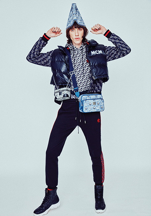 남성용 로고 윈드브레이커 패딩 2 in 1 1백5만원, 큐빅 모노그램 오가닉 코튼 스웨트 셔츠 62만5천원, 큐빅 로고 모노그램 오가닉 코튼 스웨트 팬츠 59만5천원, 빈티지 자카드 모노그램 리스틀릿 파우치 52만5천원, 빈티지 자카드 모노그램 락스타 베니티 케이스 81만원, 빈티지 자카드 모노그램 클래식 크로스 보디 93만5천원 모두 MCM.
