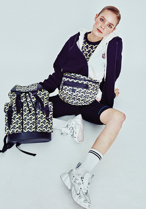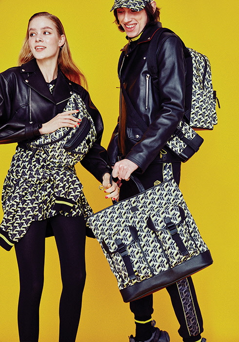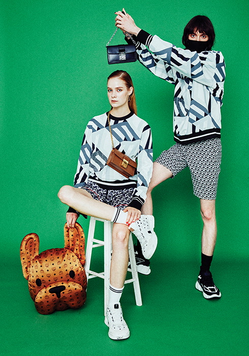 (남자) 아프레스키 오가닉 프린트 스웨트셔츠 65만원, 큐빅 자카드 울 버뮤다팬츠 65만5천원, 큐빅 로고 페이스 액세서리 11만5천원, 그레텔 크로스 보디 93만5천원 모두 MCM.