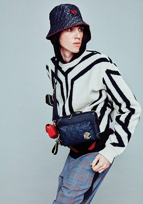 큐빅 자카드 울 슬림 핏 재킷 1백45만원, 이너로 입은 엠씨엠 컬렉션 프린트 텐셀 셔츠 61만5천원, 큐빅 모노그램 오가닉 코튼 프린트 티셔츠 34만5천원, MCM X SAMBYPEN 니트 로고 삭스 7만8천원, 큐빅 로고 자카드 캡 40만5천원, 큐빅 로고 자카드 숄 49만5천원, 큐빅 로고 자카드 숄더백 1백70만원, 큐빅 로고 자카드 숄더 미니 86만5천원, 큐빅 로고 자카드 크로스 보디 미니 81만원 모두 MCM.