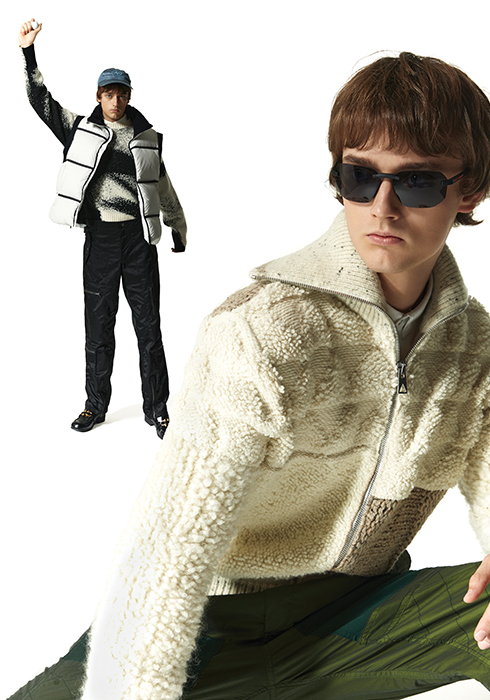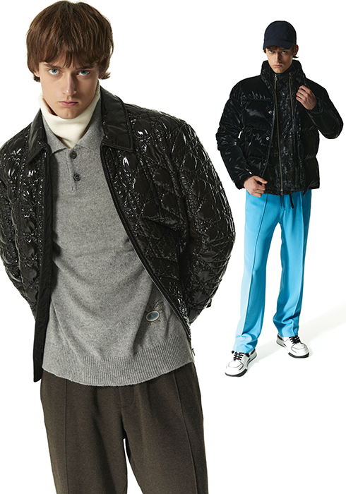 (왼쪽) 블랙 컬러의 양가죽 블루종 9백20만원, 캐시미어 소재의 그레이 컬러 폴로 셔츠 2백30만원, 캐멀 울 소재의 트랙 팬츠 가격 미정 모두 디올 맨. 화이트 컬러 풀오버 넥 워머 가격 미정 스톤 아일랜드.