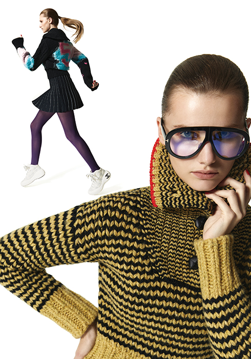 (오른쪽) 울 소재의 패턴 스웨터 가격 미정 보테가 베네타. 블랙 컬러의 아이웨어 가격 미정 톰 포드 아이웨어. |