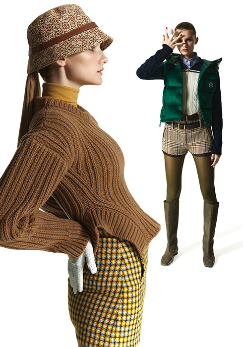 (왼쪽) 버진 울 캐시미어 소재의 브라운 컬러 스웨터 1백50만원대 토즈. 머스터드 컬러 터틀넥 풀오버 11만2천원 르 소넷. 체크 패턴 스커트 가격 미정 플랜씨. 캔버스 소재의 브라운 컬러 패턴 버킷 햇 69만원 로에베. 천연 피혁 소재의 화이트 컬러 골프 장갑 4만원대 캘러웨이. |