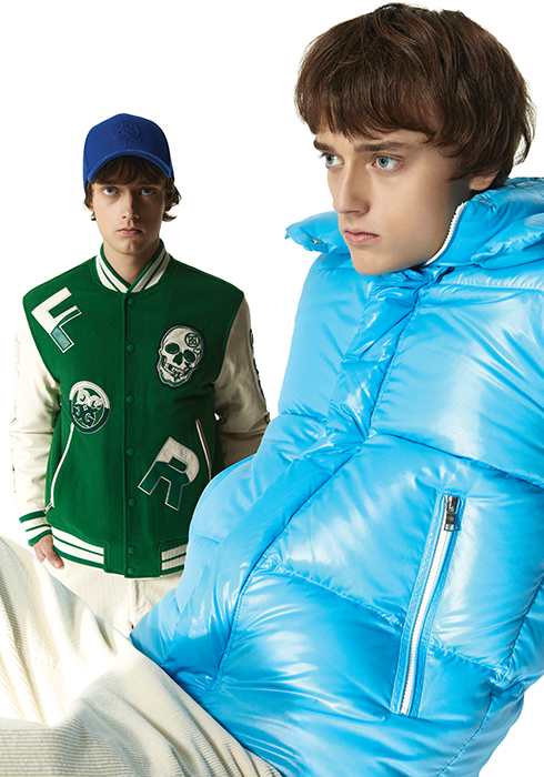 (왼쪽) 그린 컬러 패치워크 스타디움 재킷, 로고를 더한 네이비 컬러 볼 캡, 화이트 컬러 코듀로이 팬츠 모두 가격 미정 지포어.