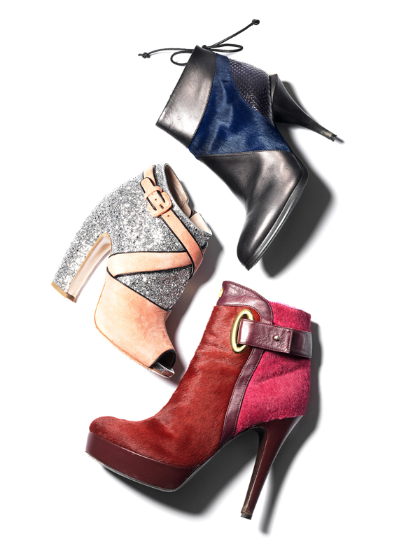 자신의 신발장에 검정색, 갈색, 회색과 같은 무난한 색과 평범한 디자인이 일색이라면 컬러 블로킹 부츠에 눈을 돌려봐도 좋겠다. 이번 시즌엔 두 가지 이상의 컬러와 서로 다른 소재끼리의 과감한 조합이 돋보인다. 가죽과 송치, 파이톤을 이어 붙이는가 하면 스웨이드와 반짝이를 섞기도 하고 강렬한 컬러를 매칭시키는 식. 신발 자체로도 포인트가 될 수 있지만 개성있는 연출을 위해서는 옷차림에도 컬러를 더하는 것이 좋다. 칼라, 포켓, 소매 끝부분에 전혀 다른 컬러가 덧대져 있는 블라우스와 재킷을 선택하거나 비비드한 솔리드 컬러 팬츠나 원피스를 믹스하는데 주저하지 말자. 단, 면 분할이 되어있는 옷은 피할 것. 스타일 전체가 산만해 보일 수 있다.