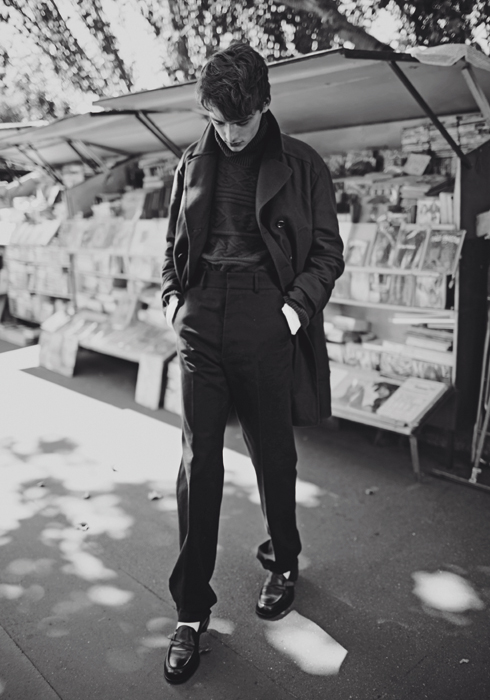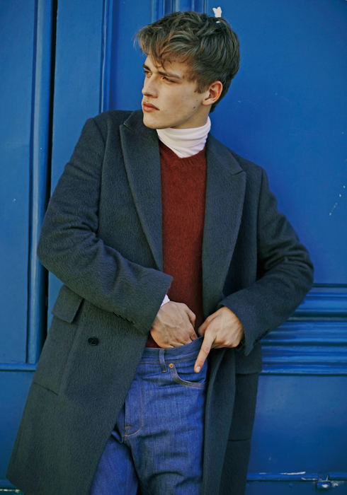 울 코트와 터틀넥 모두 Bally. 티셔츠 Gap. 팬츠 Gucci. 양말 Perofil. 모카신 슈즈 Ermenegildo Zegna Couture.