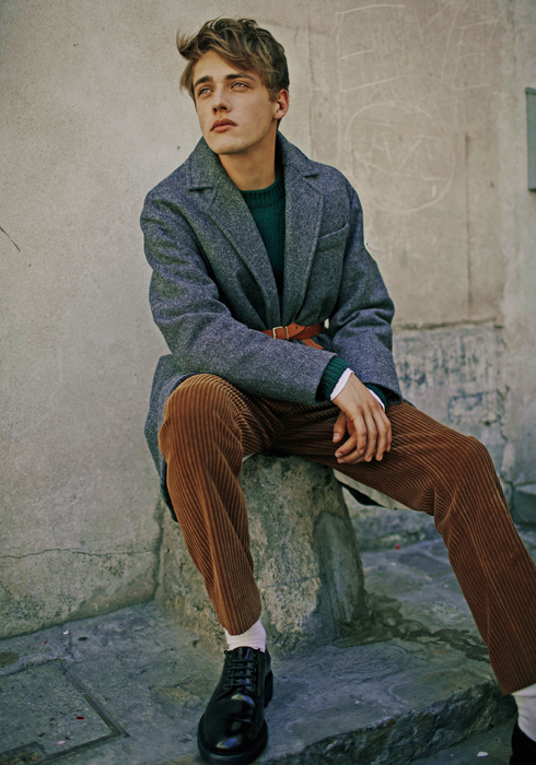 코트 Moncler Gamme Bleu. 풀오버 니트 Fendi. 벨벳 팬츠 Boglioli. 벨트 Paul Smith. 양말 Perofil. 레이스업 레더 슈즈 Corneliani.