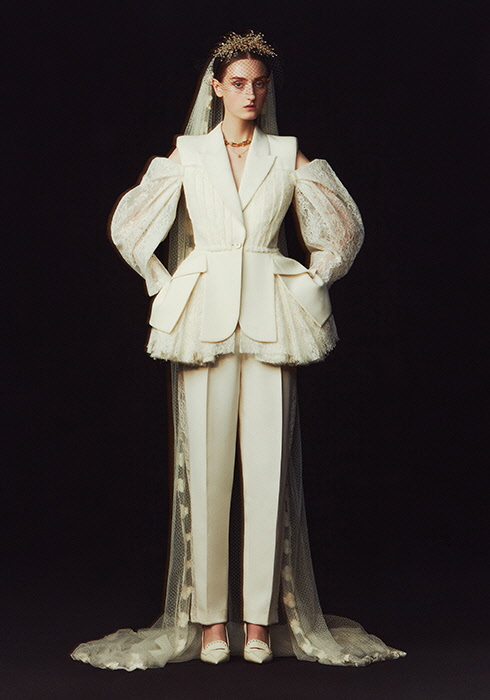 풍성한 벌룬 실루엣 퍼프 슬리브가 인상적인 레이스 컷아웃 재킷 9백57만원, 측면에 레이스 디테일을 더한 테일러드 트라우저 3백66만원 모두 알렉산더 맥퀸.
