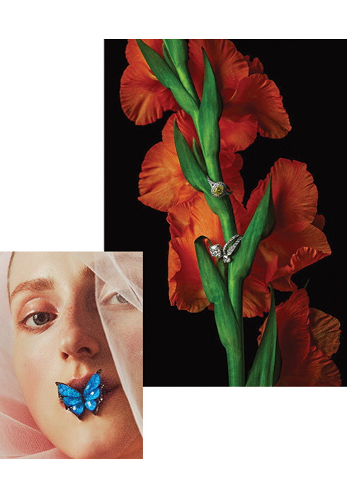 신비로운 푸른빛 오팔과 블랙 다이아몬드로 행운의 상징인 파란 나비를 형상화한 플라이 바이 나이트 크리스탈 헤이즈 링 가격 미정 스티븐 웹스터.