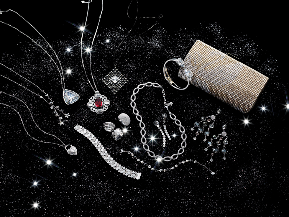 이번 시즌에는 ‘Sparkling Christmas with Swarovski’ 라는 테마 아래 크리스마스를 연상케 하는 심벌을 적용한 점이 특징이다. 여성스러운 실루엣과 볼륨감이 돋보이는 리본 모티브 이어링과 네크리스, 밤하늘을 수놓은 별을 형상화한 별 모티브 네크리스와 가느다란 팔찌, 트라이앵글 형태의 볼드한 뱅글과 네크리스가 대표적이다. 특히 트라이앵글 모티브의 ‘스펙트럴(spectral)’ 라인은 메탈 케이지 안에 크리스털을 담는 정교한 기술을 적용한 것으로, 어느 장소, 어느 각도에서 보아도 눈부신 빛을 발산한다. 트라이앵글이 여러 개 달린 초커 형태의 볼드한 네크리스와 가는 체인에 펜던트가 달린 네크리스, 손목에 딱 붙는 뱅글을 함께 착용하면 멋스럽게 연출할 수 있다. 더욱 화려하고 여성스럽게 연출하고 싶다면 ‘시에나(sienna)’ 라인을 선택하면 좋다. 크리스털과 블랙 메탈로 무늬를 만든 필리그리(filigree) 디테일로 극명한 대비 효과를 주며, 다이아몬드 실루엣은 최신 트렌드와 완벽한 조화를 이룬다. 스와로브스키의 2012 F/W 콘셉트인 록 시크 테마를 가장 잘 반영한 라인이기도 한다. 일본의 유명 디자이너 요시오카 도쿠진(Yoshioka Tokujin)으로부터 영감을 얻은 ‘레이크 오브 쉬머(lake of shimmer)’는 절제된 디자인으로 최대한 미니멀하고 심플하게 완성했다. 동그란 원형에 스와로브스키 크리스털을 번갈아 세팅한 일자형의 이어링과 가느다란 네크리스는 도회적인 현대 여성들을 만족시키기에 충분할 듯. 모든 컬렉션에는 스와로브스키만의 독창적인 포인티아지(PointiageⓇ) 기술을 적용해 반짝임과 광채를 극대화한 점도 주목할 만하다.