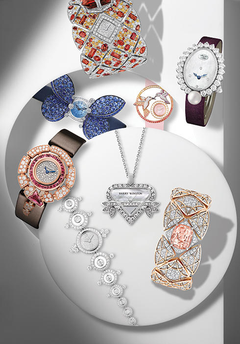 1 (왼쪽 아래부터 시계 방향으로) 부쉐론 조이 드 뤼미에르 워치. 불가리 세르펜티 인칸타티 워치. 그라프 프린세스 버터플라이 시크릿 워치. 샤넬 화인 주얼리 시그너처 그레나트 시크릿 워치. 부쉐론 아주레 오피 워치. 브레게 펄 임페리얼 하이 주얼리 워치. 샤넬 화인 주얼리 시그너처 사파이어 시크릿 워치. 해리 윈스턴 로즈버드 하트 워치.