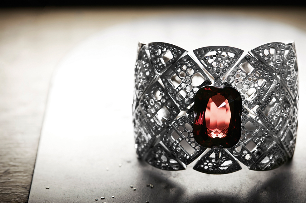 바젤월드의 샤넬 화인 주얼리 부스를 방문할 때면, 이들이 또 우리에게 어떤 아름다운 판타지를 선물할까, 기대감에 사로잡힌다. 샤넬 화인 주얼리는 2년 동안 연속적으로 출시한 ‘레 에떼르넬 드 샤넬’ 컬렉션을 통해 새로운 하이 주얼리 워치 모델을 선보여왔다. 올해는 샤넬의 아이콘인 퀼팅 패턴을 키 모티브로 선정해 금실과 은실을 섞어 짠 라메 패브릭처럼 주얼리를 섬세하게 묘사한 것이 특징이다. 볼드한 하이 주얼리 브레이슬릿처럼 보이지만 중앙에 자리 잡은 미러 효과의 스퀘어 다이아몬드를 오픈하면 그 안에 럭셔리한 워치 다이얼이 살며시 자태를 드러내는 것을 확인할 수 있다. 5.26캐럿의 센터 스톤을 중심으로 라운드형 다이아몬드와 16개의 삼각형 조각으로 파베 세팅한 퀼팅 패턴의 ‘시그너처 디아망 시크릿 워치’부터 핑크 모가나이트, 매혹적인 쿠션 컷 가닛 등 시선을 강탈하는 아름다운 스톤들을 더한 다양한 시크릿 워치를 선보인다. 이 모든 컬렉션에는 샤넬 화인 주얼리의 쿠튀르 정신을 담아 장인들의 손끝에서 정교하고 아름다운 창조물로 탄생했다.