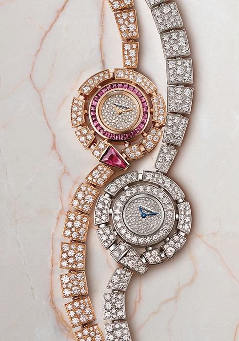 불가리의 하이 주얼리 역사에서 빼놓을 수 없는 상징적인 모티브는 뱀의 형상을 한 ‘세르펜티’다. 불가리는 이탈리아를 대표하는 주얼러이자 스위스에 매뉴팩처를 둔 워치메이킹 브랜드로서, 시계 역사만 해도 1백여 년이 넘는 오랜 전통을 지녔다. 올해 바젤월드의 하이 주얼리 워치 컬렉션에서는 그들의 주얼 세공 기술을 백분 발휘하며 불멸의 미를 상징하는 세르펜티를 화려하게 부활시켰다. 이를 대변하듯 바젤월드 메인 홀 입구에 위치한 불가리 부스의 쇼윈도에는 세르펜티를 상징하는 모티브와 세르펜티 신제품 워치를 디스플레이해 행운의 상징이기도 한 뱀의 진정한 매력을 보여주었다. 새롭게 재탄생한 ‘세르펜티 인칸타티’는 투르비용 버전을 포함해 우아한 새틴 스트랩 또는 다이아몬드를 세팅한 주얼 브레이슬릿의 하이 주얼리 워치 등 다양한 버전으로 선보인다. 특히 주얼리 브레이슬릿의 경우 다이아몬드를 세팅했음에도 놀랄 만큼 편안하고 유연한 착용감을 자랑하는 것이 특징. 이는 모든 주얼리 피스를 제작할 때 주얼리가 화려하게 빛나면서도 최상의 편안함을 선사할 수 있도록 디자인했기에 가능한 것이다.