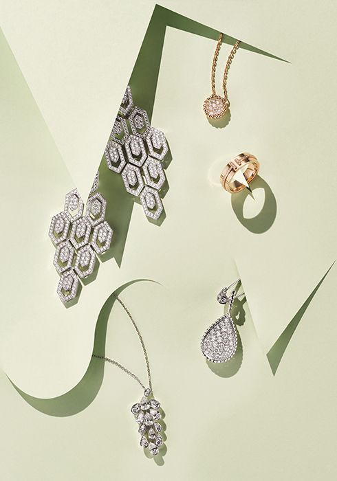 브랜드를 상징하는 T 문양을 다이아몬드로 세팅한 티파니 T 트루 링 4백10만원대 티파니. 하이 주얼리에만 사용하는 오픈워크 기술을 적용해 다이아몬드를 세팅했다. 브로치 또는 네크리스 펜던트로도 착용할 수 있는 세뻥 보헴 롱 네크리스 3천만원대 부쉐론. 빗방울에서 영감받아 탄생한