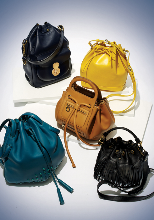 브랜드를 대표하는 ‘리키 백’을 버킷 실루엣으로 재해석한 리키 드로스트링 백. 32X22cm, 2백80만원 랄프 로렌 컬렉션. 1932년에 탄생한 노에 버킷 백을 매력적인 미니 사이즈로 재해석한 옐로 컬러의 노에 BB백. 24X22cm, 2백만원대 루이 비통. 과거 아카이브에서 영감을 받은 제품으로 둥근 손잡이가 인상적인 살바토레 드로스트링 백. 26X27cm, 가격 미정 페라가모. 개성 있는 프린지 장식으로 트렌디함을 갖춘 엠마누엘 백. 17.5X14cm, 2백67만원 생로랑. 말안장과 마구에서 영감을 받아 말고삐를 연상케 하는 끈 디테일이 인상적인 그린 컬러 버킷 백. 29X32cm, 2백만원대 토즈.