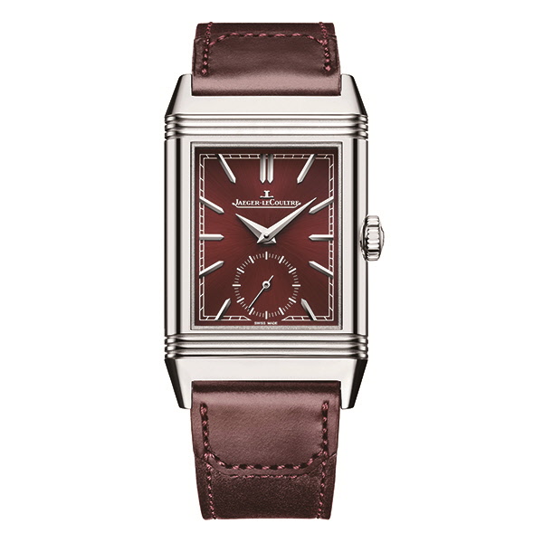 짙은 와인 컬러 다이얼과 스트랩이 감각적인 리베르소 트리뷰트 스몰 세컨즈 가격 미정 예거 르쿨트르.