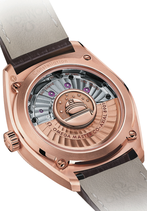 3 글로브마스터 케이스 백에는 오메가의 히스토리를 느낄 수 있는 크로노미터 관측소의 이미지를 새겼다. 8개의 별은 오메가가 세운 정확성의 기록이자 마스터 크로노미터 인증을 받기 위한 여덟 가지 METAS 인증 기준을 의미한다.