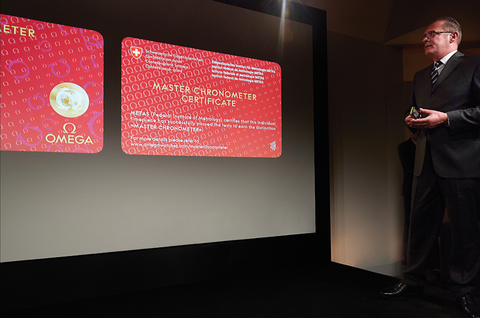 7 오메가 상품 개발 및 고객 서비스 부사장 장-클로드 모나숑이 메타스 인증 기준을 자세히 설명하고 있다.