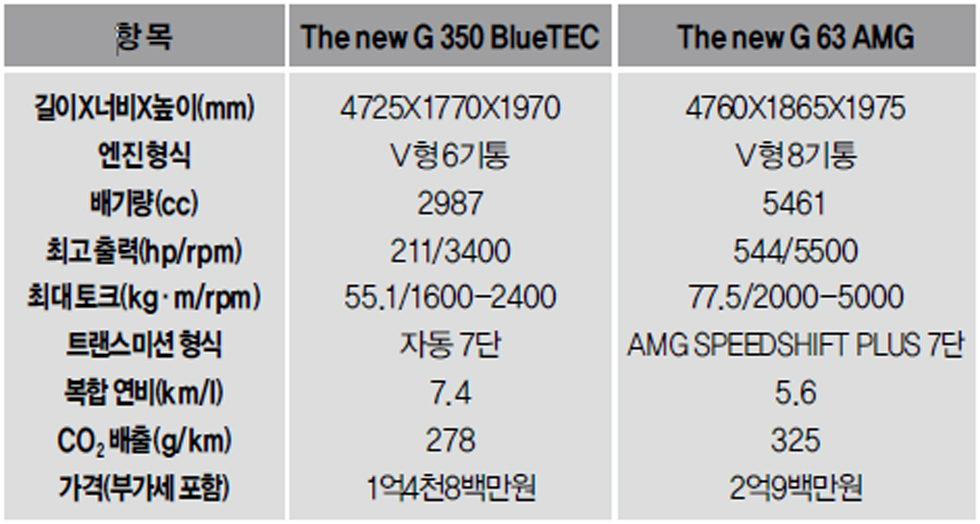 2,  4 이번에 국내 시장에 선보인 뉴 G-클래스에는 V형 8기통 엔진을 탑재한 The new G 63 AMG 모델과 V형 6기통 엔진을 장착한 The new G 350 BlueTEC 모델이 있다.
