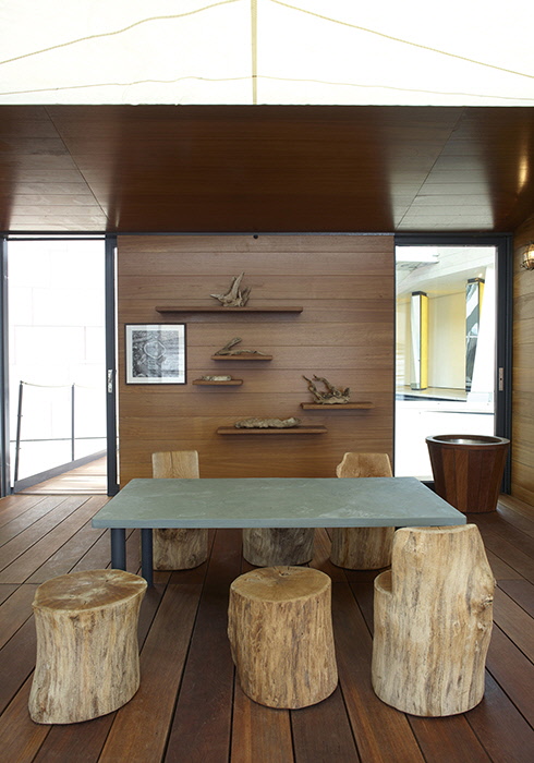 페리앙은 1930년에 접어들면서 차가운 기능주의에 천착한 듯한 경향으로 흘러버린 모던 디자인을 넘어 자연미가 깃든, 보다 인간 중심적인 디자인에 애정을 쏟았다. 1934년에 구상해 <오늘의 건축>이라는 잡지에서 수상한 ‘물가 위의 집(La Maison au Bord de l’Eau)’이 그 같은 관심이 반영된 대표적인 프로젝트로 꼽힌다. 지나치게 현대적(modern)이라는 이유로 스케치로만 남은 미완의 작품이었지만 페리앙 재단과 루이 비통, 카시나 등의 다각적 협업으로 7년 전 디자인 마이애미에서 처음 선보였고, 루이 비통 재단 미술관의 회고전에도 등장해 화제가 됐다. 노동자 가정을 위해 지었다는 조립식 건축물은 내부에 통나무로 만든 가구가 아기자기하게 자리하고 있다. 또 동시대의 가구와 예술품이 어우러진 ‘젊은이를 위한 집(Maison du Jeune, 1935)’이라든지 로켓처럼 생긴 유목 건축물 ‘레퓌주 토노(Refuge Tonneau, 1938)’ 등도 자연으로의 회귀를 담고 있다. 그 정점을 보여주는 건축물은 레자크(Les Arcs) 스키 리조트다. 산비탈과 결을 같이하듯 누워 있는 이 건축물은 자연과 산을 향한 그녀의 사랑이 녹아 있는 듯하다.