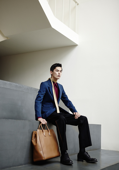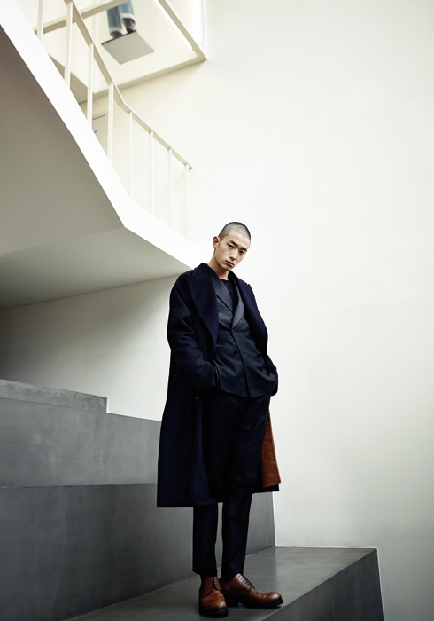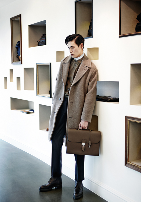 네이비 롱 코트 5백70만원대, 그레이 그러데이션 더블브레스트 재킷 5백30만원대, 네이비 팬츠 1백70만원대, 블랙 니트 1백만원대, 브라운 더비 슈즈 가격미정 모두 루이 비통. |