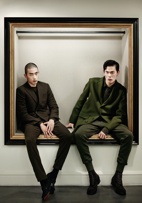 (왼쪽) 카키 더블브레스트 수트 가격미정 랄프 로렌. 카키 니트 톱 54만원 폴 스미스. 블랙 태슬 슈즈 1백만원대 크리스찬 루부탱. (오른쪽) 그린 코트 가격미정, 카키 집업 셔츠 가격미정, 카키 스웨트 팬츠 가격미정, 레이스업 부츠 가격미정 모두 보테가 베네타. |