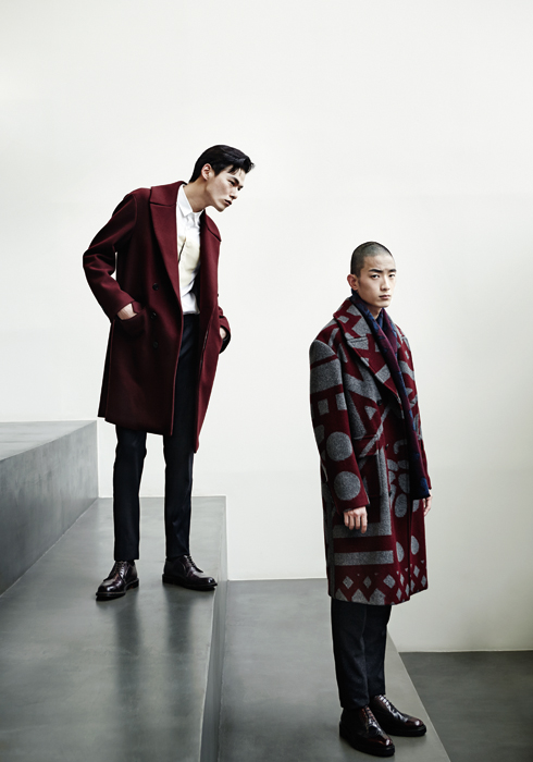 (왼쪽) 버건디 더블브레스트 코트 가격미정, 화이트 셔츠 가격미정, 블랙 팬츠 가격미정 모두 우영미. 버건디 레이스업 슈즈 1백10만원 알든 by 유니페어. (오른쪽) 그레이 & 버건디 패턴 더블브레스트 코트 4백60만원, 다크 그레이 팬츠 1백15만원 모두 버버리 프로섬. 버건디 & 네이비 패턴 스카프 92만원, 버건디 레이스업 슈즈 1백5만원 모두 버버리. |