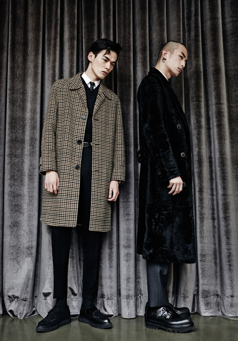 (왼쪽) 브라운 체크 코트 3백70만원대, 화이트 셔츠 70만원대, 블랙 베스트 가격미정, 블랙 팬츠 1백만원대, 네이비 타이 20만원대, 블랙 벨트 50만원대, 블랙 클리퍼 슈즈 1백만원대 모두 생로랑. (오른쪽) 블랙 더블브레스트 퍼 코트 가격미정 조르지오 아르마니. 그레이 수트 1백79만원, 화이트 셔츠 33만원 모두 휴고 보스. 블랙 뭉크 스트랩 슈즈 가격미정 엠포리오 아르마니. |